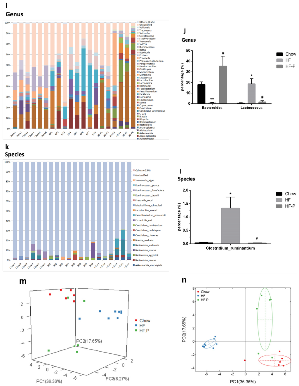 Composition analysis of gut microbiota at the: (a,b) phylum; (c,d) class; (e,f) order; (g,h) family; (i,j) genus; and (k,l) species level in Chow, HF, and HF-P groups; (m) Principal component analysis (PCA) and (n) clustering analysis of gut microbiota in Chow, HF, and HF-P groups (** p < 0.01 vs. Chow, * p < 0.05 vs. Chow, ## p < 0.01 vs. HF, # p < 0.05 vs. HF, one way ANOVA).