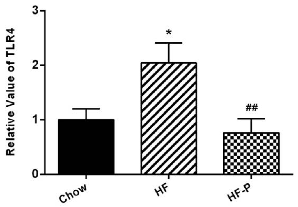 TLR4 mRNA expression in the ileal tissue of rats in the Chow, HF, and HF-P groups (* p < 0.05 vs. Chow, ## p < 0.01 vs. HF, one way ANOVA).