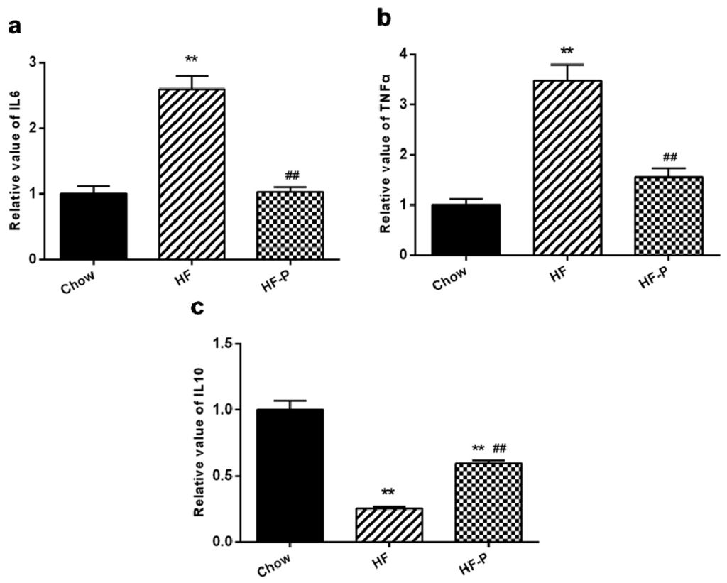 The mRNA levels of (a) tumor necrosis factor alpha (TNFα); (b) interleukin (IL)-6 and (c) IL-10 in the ileal tissue in Chow, HF, and HF-P groups (** p < 0.01 vs. Chow, ## p < 0.01 vs. HF, one way ANOVA).