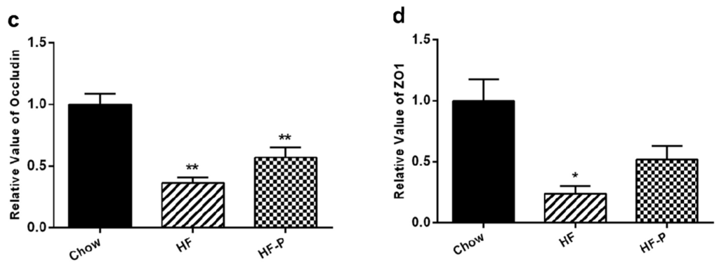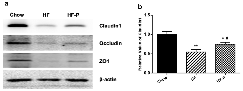 The expression levels of claudin1, occludin and zonula occludens-1 (ZO-1) proteins in rats of the HF group were significantly lower than those in the Chow group (claudin1, 0.55 ± 0.18 vs. 1.00 ± 0.22, p < 0.01; occludin, 0.36 ± 0.11 vs. 1.00 ± 0.23, p < 0.01; ZO-1, 0.24 ± 0.15 vs. 1.00 ± 0.40, p < 0.05). Supplementation of pectin significantly improved the level of claudin1 but only caused a tendency of increase in the levels of occludin and ZO-1 as compared with the high fat diet alone (claudin1, 0.76 ± 0.14 vs. 0.55 ± 0.18, p < 0.05; occludin, 0.57 ± 0.21 vs. 0.36 ± 0.11, p = 0.060; ZO-1, 0.52 ± 0.25 vs. 0.24 ± 0.15, p = 0.172) (Figure 7).