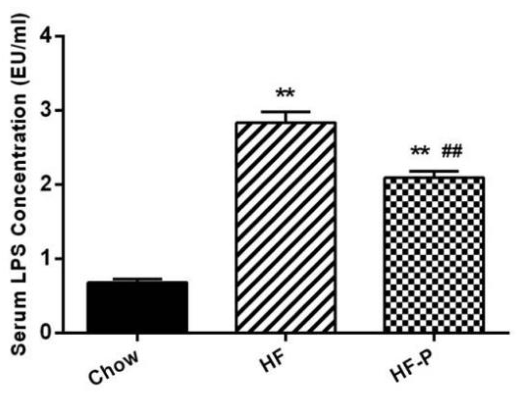 Serum LPS concentration (EU/mL) in Chow, HF, and HF-P groups. (** p < 0.01 vs. Chow, ## p < 0.01 vs. HF, one way ANOVA).
