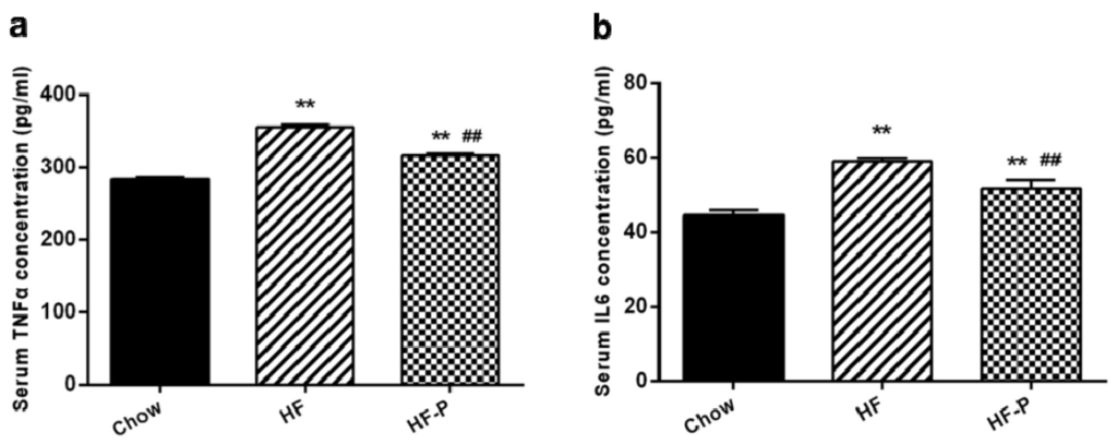 Portal serum levels of (a) TNFα and (b) IL-6 in Chow, HF, and HF-P groups (** p < 0.01 vs. Chow, ## p < 0.01 vs. HF, one way ANOVA).