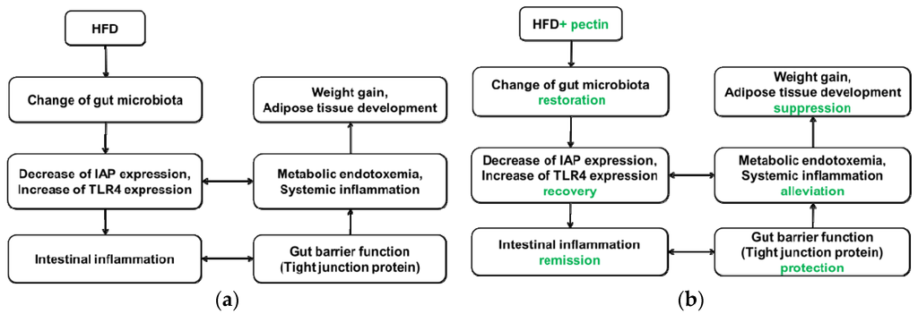 (a) Proposed model by which HFD leads to weight gain and adipose development. HFD leads to disturbance of gut microbiota, possibly by decreasing IAP expression and increasing TLR4 expression, which may result in metabolic endotoxemia and intestinal and systemic inflammation. Intestinal inflammation results in altered gut barrier function and promotes penetration of LPS from the lumen to the lamina propria. The precise mechanism by which metabolic endotoxemia leads to weight gain and adipose tissue development is not clear; (b) Proposed model by which supplementation of apple-derived pectin suppresses weight gain and adipose development. Pectin supplementation maintains gut microbiota, promoting recovery of IAP and TLR4 levels, which may alleviate metabolic endotoxemia and intestinal and systemic inflammation. Thus, gut barrier function is protected and penetration of LPS from the lumen to the lamina propria is suppressed. These events lead to suppression of weight gain and adipose development.