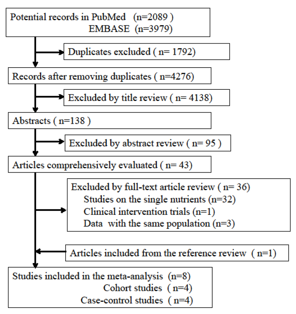 | Mai V., 2005 [32] | 1987–1998 | Cohort | USA | The Breast Cancer Detection Demonstration Project cohort | Female | 353 | 42,254 | FFQ-62 items, validated, mailed | Priori | Increasing consumption of fruits, vegetables, whole grains, lean meats or meat alternatives, and low-fat dairy. | High RFS (the Recommended Foods Score) dietary pattern | 0.62 (0.46–0.84) | Energy intake, smoking, NSAID (nonsteroidal anti-inflammatory drug) use, and BMI (body mass index), smoking duration and cigarettes/day | 8 |