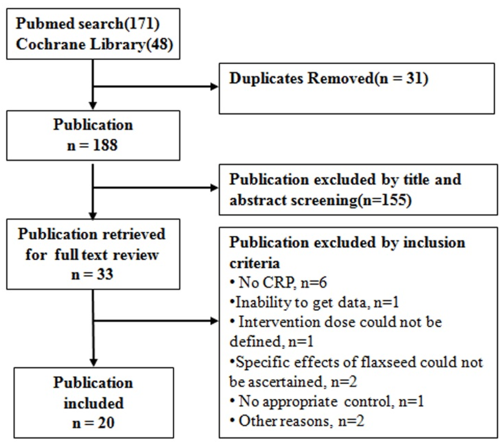 Studies were included for analysis if they met the following criteria: (1) The subjects consumed flaxseed or its derivatives for at least 2 weeks; (2) the study was an RCT with either a parallel or crossover design; (3) the study reported the dose of flaxseed, lignans, or flaxseed oil (or ALA); and (4) the effects of flaxseed or its derivatives on inflammatory marker CRP could be extracted from the report.