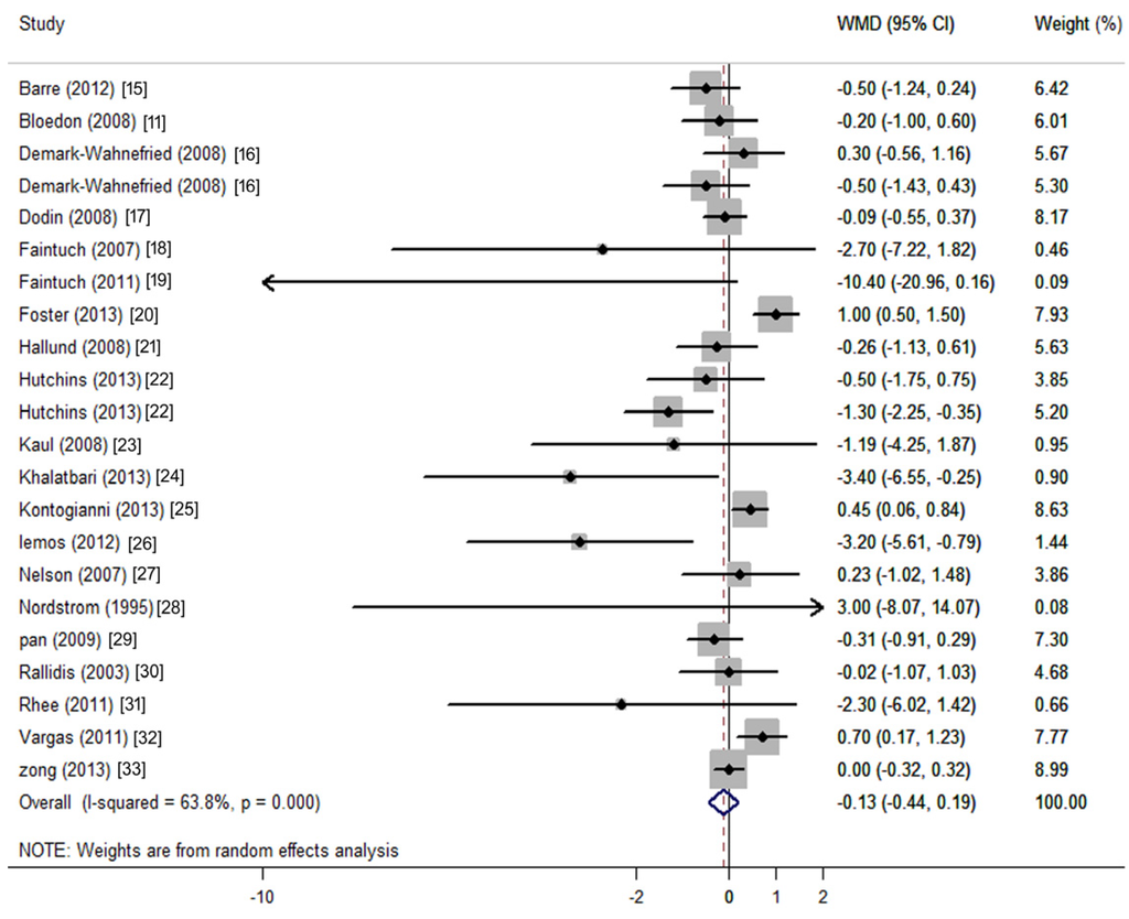 Meta-analysis of flaxseed intervention on net changes (95% CI) of CRP. CI: confidence interval. WMD: weighted mean difference; The horizontal lines denote the 95% CIs: some of which extend beyond the limits of the scales. The square represents the point estimate of each study. The diamond represents the overall pooled estimate of the treatment effect.