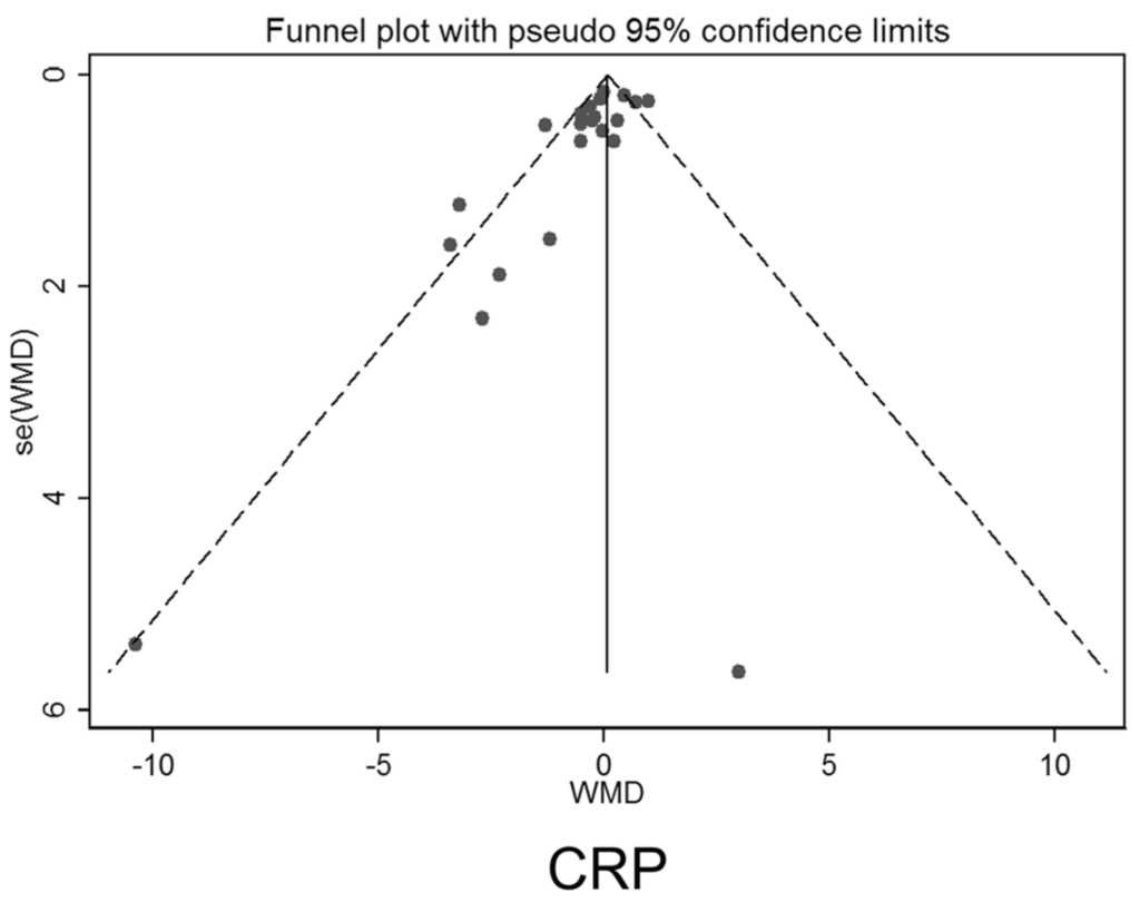 Both the funnel plot and Egger’s test (p = 0.007) showed evidence of publication bias in CRP (Figure 3).