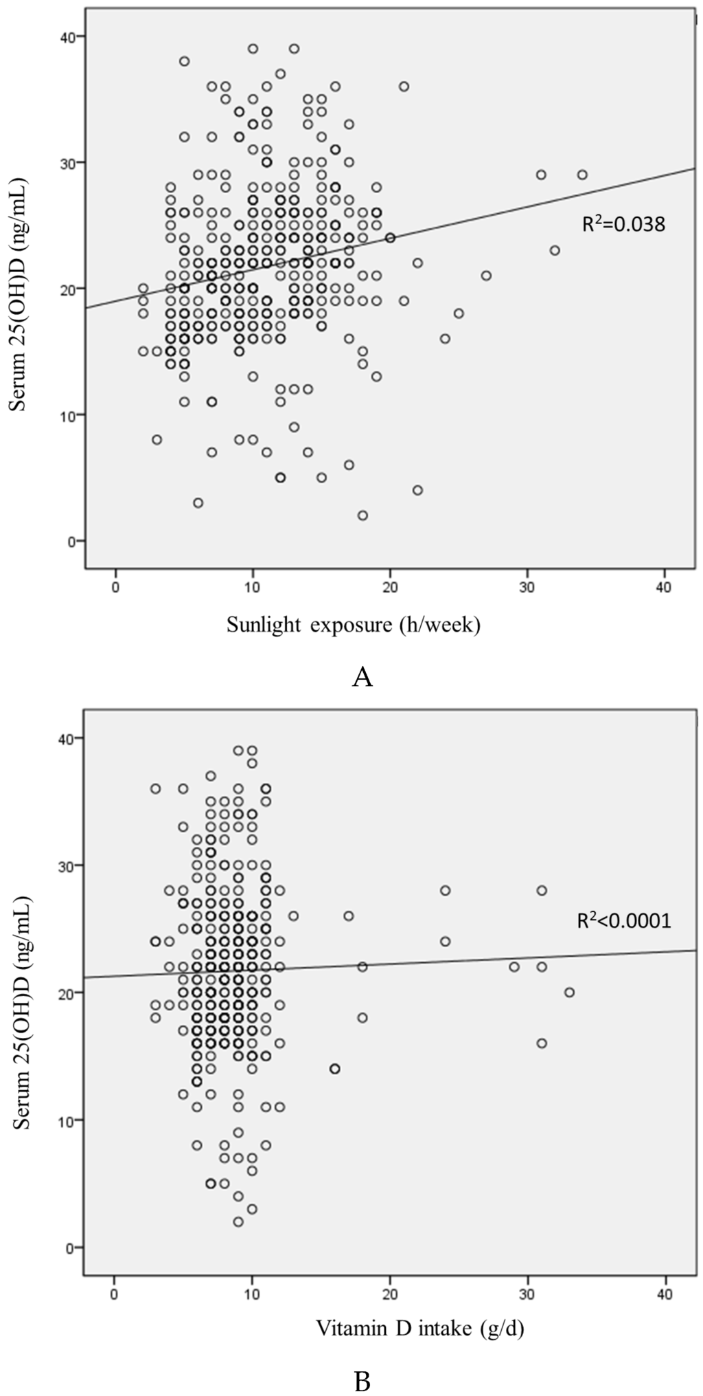 The plots of serum 25(OH)D, sunlight exposure (A) and dietary vitamin D (B).