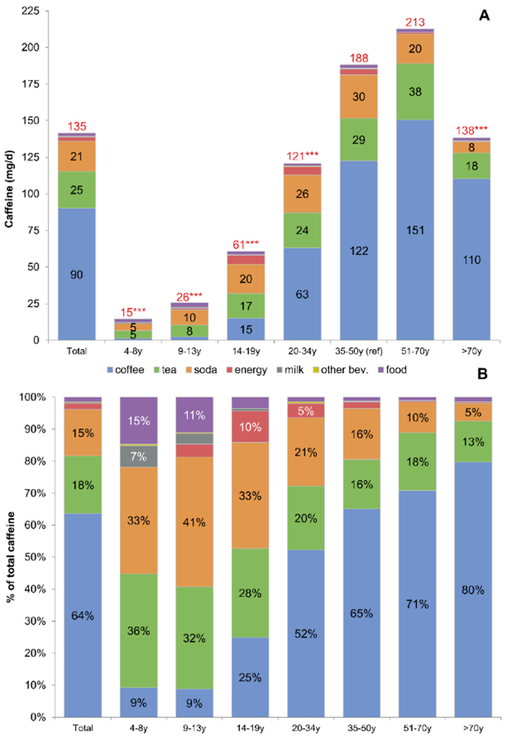 Assessing the dietary sources of caffeine among US children and adults has implications for public health policy. Caffeine, a mild stimulant [1,2], is a frequently consumed dietary constituent, which is an added ingredient or is naturally present in varying amounts in both beverages and solid foods [3,4,5,6,7]. Caffeine is recognized by the US Food and Drug Administration as safe for adults in amounts < 400 mg/day [8]. The 2015 Dietary Guidelines Advisory Committee (DGAC) report concluded that there was only limited evidence to link high-dose caffeine intakes with health risks for children and adults [9]. However, whereas the high dose for adults was set at 400 mg/day, the dose for children was not determined [9]. Some concerns remain about the consumption of energy drinks by children and teenagers, particularly due to their high caffeine content, but also due to their energy content [10,11].