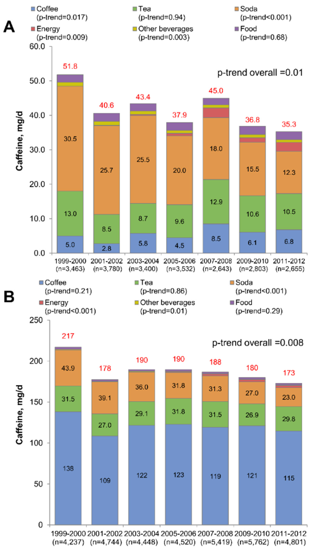 A number of limitations should be noted. First, like any dietary study, some foods/beverages may be under-reported or portion sizes estimated with error. The under-reporting of some beverages, namely sugar-sweetened beverages, might result in under-estimates of caffeine consumption. Second, for each single food/beverage item reported only a single estimate of caffeine content was used. The dietary database used here contains more than 7000 foods/beverages with numerous options that differentiate decaffeinated and caffeinated beverages. For example, the database includes more than 50 varieties of coffee/coffee drinks, 30 types of tea and numerous caffeinated and decaffeinated versions of soda. Variability in caffeine content may lead to error; this is particularly a concern for brewed coffee and hot tea [25]. Lastly, this analysis focused on dietary sources of caffeine, therefore caffeine from supplements were not included. Despite these limitations, the current data are the best suited to examine US trends in caffeine consumption in a large and nationally representative sample.