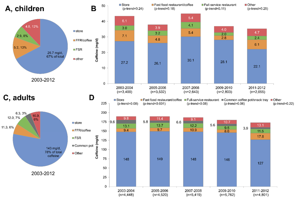 From 2003 to 2004 onward, trends in caffeine consumption by location of origin were evaluated for children and adults, separately. Locations of origin evaluated included stores, fast food restaurants/coffee shops, full-service restaurants, common coffee pot, and other sources. Trends in each source of caffeine were evaluated using a survey-weighted linear regression with survey cycle/year as a continuous variable. Data from five cycles including location of origin data (e.g., 2003–2004 through 2011–2012) were pooled to provide a summary estimate of sources of caffeine over the study period. Additional analyses evaluated trends in caffeine consumption stratified by location of origin (e.g., stores or fast food/coffee restaurant) and type of beverage (e.g., coffee, tea, or soda), with trends evaluated in a similar manner.