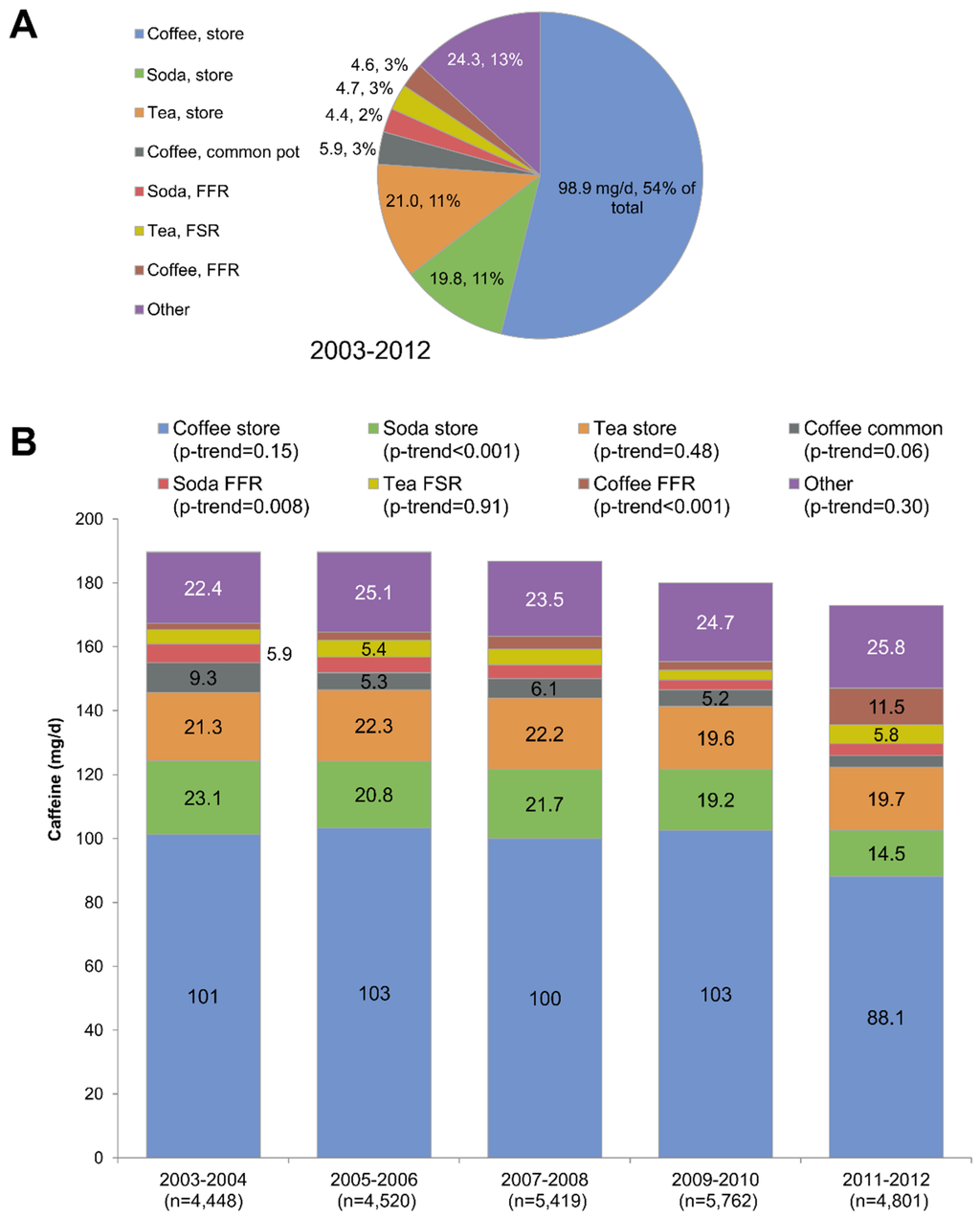 Figure 5 shows time trends for caffeine consumption by adults from 2003 to 2012 by location of origin and beverage type. As shown in Figure 5A, 99 mg/day of caffeine (or 54% of total) came from store-bought coffee. Another 21 mg/day (11%) came from store-bought tea and 20 mg/day (11%) from store-bought sodas (11%), followed by coffee from a common pot and from fast food restaurants or coffee shops. Figure 5B, illustrating time trends, shows a decline in caffeine from store bought soda and an increase in caffeine from FFR and coffee shops. Both trends were significant.