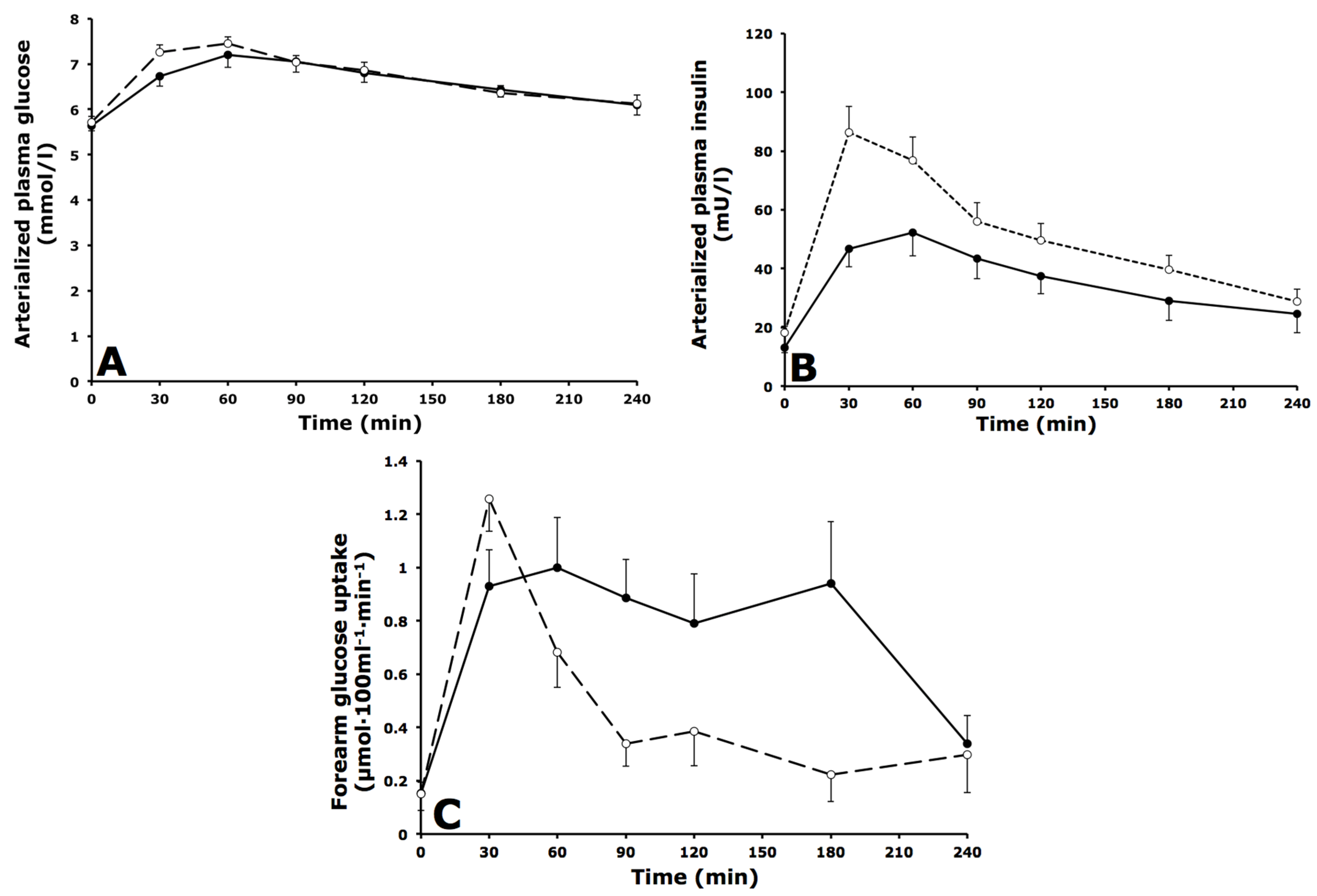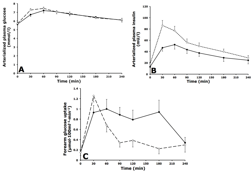 Fasting and postprandial glucose and insulin responses. (A) Arterialized plasma glucose concentrations; (B) Arterialized plasma insulin concentrations; (C) Net glucose uptake across forearm muscle during fasting (t = 0) and after consumption of a high-fat mixed-meal in IFG (black circles, solid lines) and IGT subjects (open circles, dashed lines). Values are mean ± SEM.