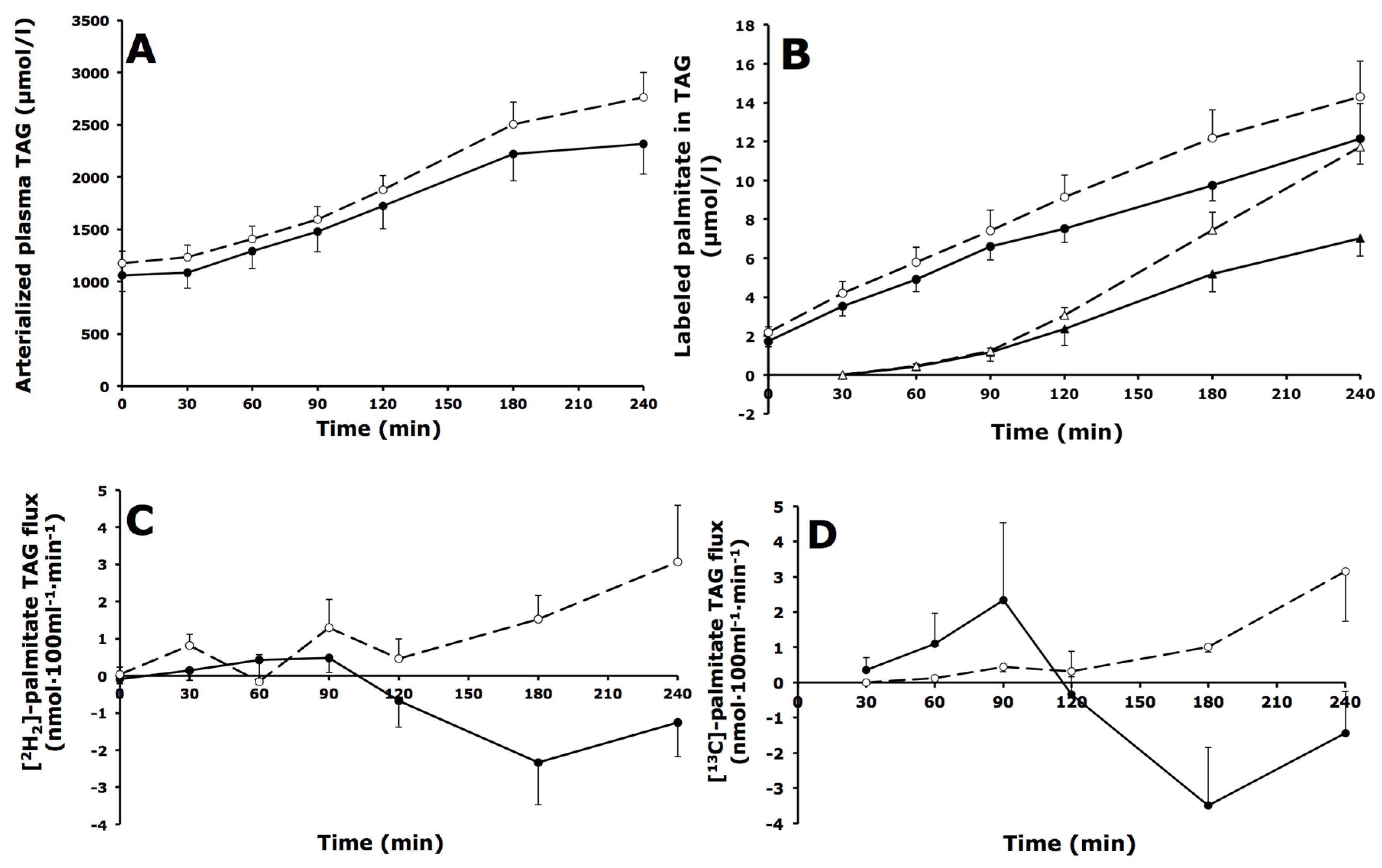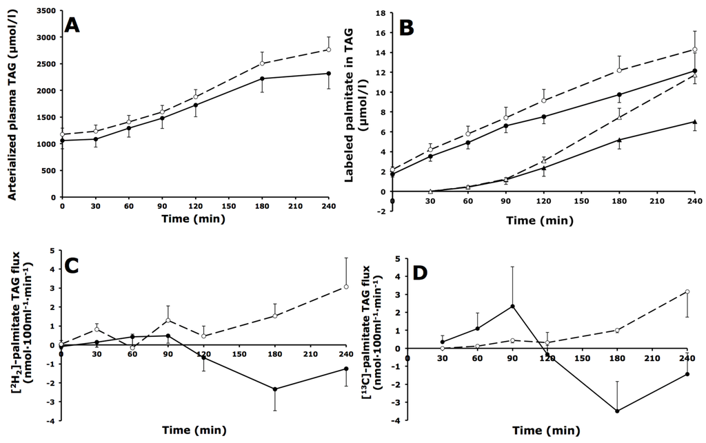 Fasting and postprandial whole-body triacylglycerol (TAG) metabolism. (A) Arterial plasma TAG concentrations; (B) [2H2]- and [U-13C]-palmitate concentrations in the plasma TAG fraction; (C) Net flux of [2H2]-palmitate TAG; (D) Net flux of [U-13C]-palmitate TAG across forearm muscle during fasting (t = 0) and after consumption of a high-fat mixed-meal in IFG (black symbols, solid lines) and IGT subjects (open symbols, dashed lines). Circles represent [2H2]-palmitate TAG; triangles represent [U-13C]-palmitate TAG. Values are mean ± SEM.