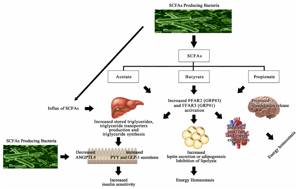 SCFA-producing bacteria primarily produce acetate, butyrate, and propionate, which leads to increased FFAR2 and FFAR3 activation. These enhancements of FFAR2 and FFAR3 not only promote noradrenalin release, but also increase heart rate and energy expenditure for energy homeostasis. SCFAs are involved in increased leptin secretion, adipogenesis, and the inhibition of lipolysis in adipose tissues. In the intestine, SCFAs enhance the secretion of PPY and GLP-1. Moreover, an improvement of triglyceride synthesis occurs due to an influx of SCFAs into the liver, which leads to decreased ANGPTL4 activation in the intestines. In addition, SCFA-producing bacteria regulate the suppression of ANGPTL4, an inhibitor of LPL, which promotes increased lipid clearance.