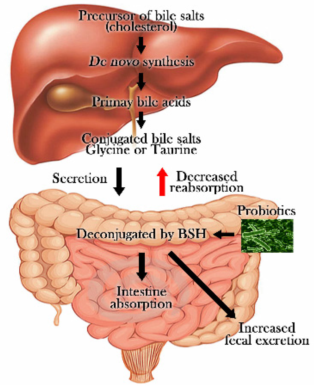 Cholesterol is utilized as the precursor for synthesis of new conjugated bile acids, and the activation of BSH by probiotics catalyzes primary bile acids to create deconjugated bile acids that are less soluble and less efficiently reabsorbed in the intestine and liver. Decongugated bile acids also contribute to the elimination of cholesterol in the feces.