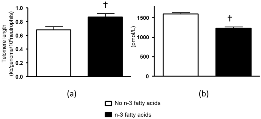 (a) Post intervention neutrophil telomere length corrected for neutrophil count and adjusted for baseline values in patients taking n-3 fatty acids compared with those not taking n-3 fatty acids. † p = 0.015 for main effect of n-3 fatty acids post-intervention adjusted for baseline values; (b) Post-intervention plasma F2-isoprostanes in patients taking n-3 fatty acids compared with those not taking n-3 fatty acids. † p < 0.001 for main effect of n-3 fatty acids post-intervention adjusted for baseline values. Values are means ± SEM.