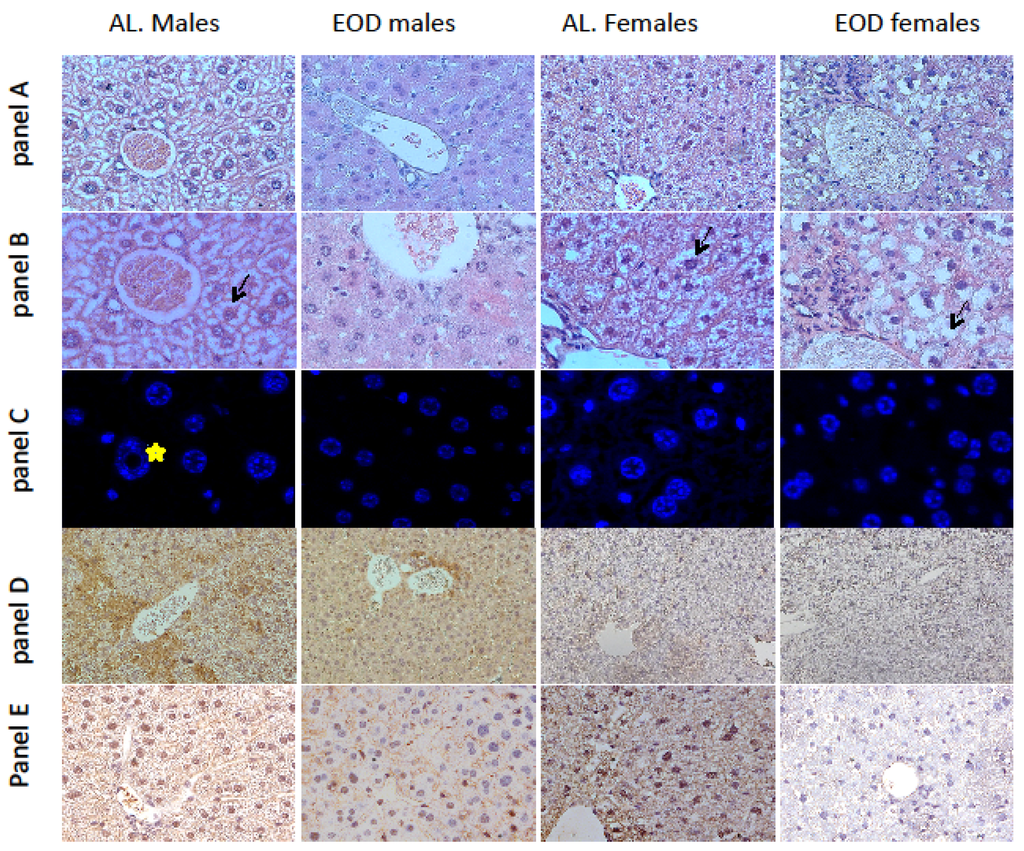In the histological sections of EOD males we noted a small amount of small-size lipid droplets. The hepatocyte plates were well developed and sinusoids were clearly visible. We observed no signs of inflammation (Figure 1A,B). In the H-E sections of AL fed males, we observed significant deposits of lipids in the cytoplasm of the hepatocytes indicated with black arrow on panel B AL Males. In addition, the hepatocytes and sinusoids were enlarged and the plates of the hepatocytes were well developed. We observed no signs of inflammation (Figure 1A,B). Sections of liver collected from EOD female mice revealed large lipid droplets in the hepatocytes as compared to AL fed females indicated with black arrow on panel B ALl Females and EOD Females. In addition, the hepatocyte plates were well developed and the sinusoids were poorly visible compared to AL fed females.