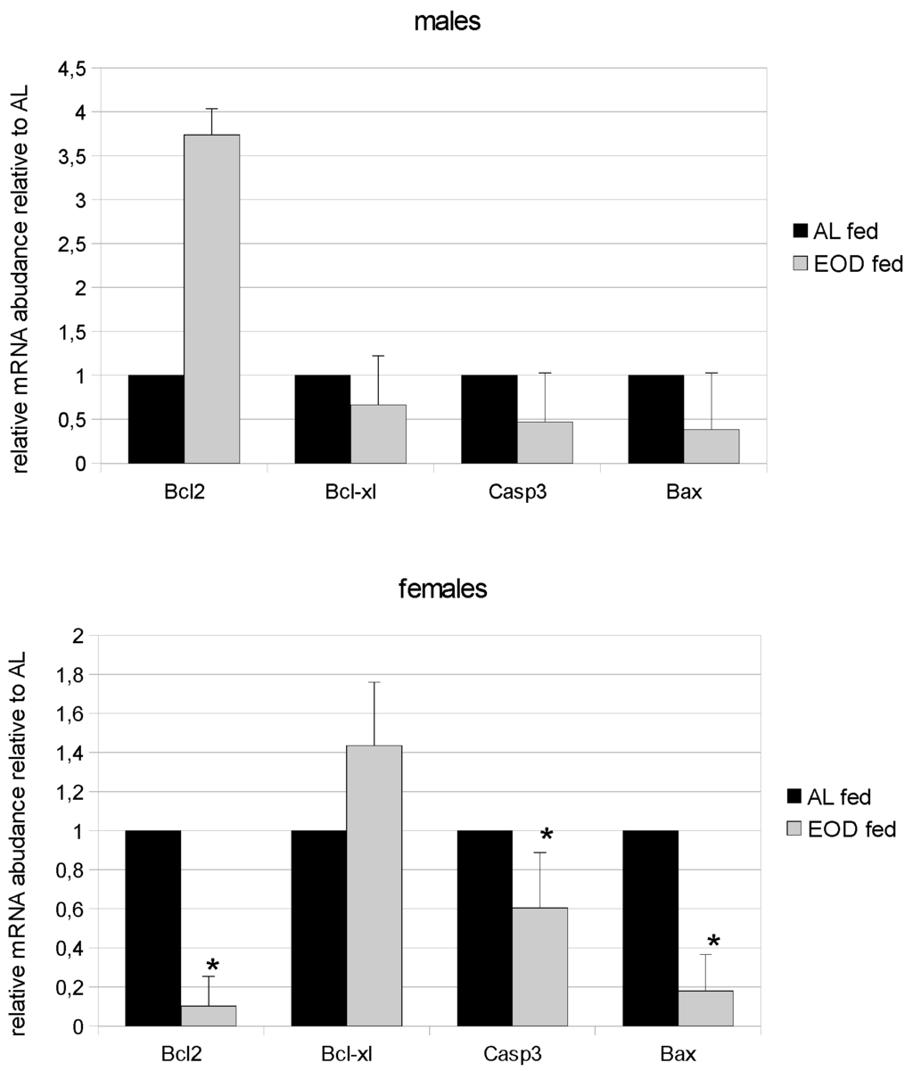 The expression of apoptotic proteins (caspase 3 and Bax) indicates apoptosis. In EOD animals (both males and females) we observed a decrease in mRNA expression for caspase 3 and Bax compared to AL males and females (Figure 3); however, these differences were only statistically significant for females. We observed no significant changes in the expression of mRNA for caspase 3 and Bax among control females and males.