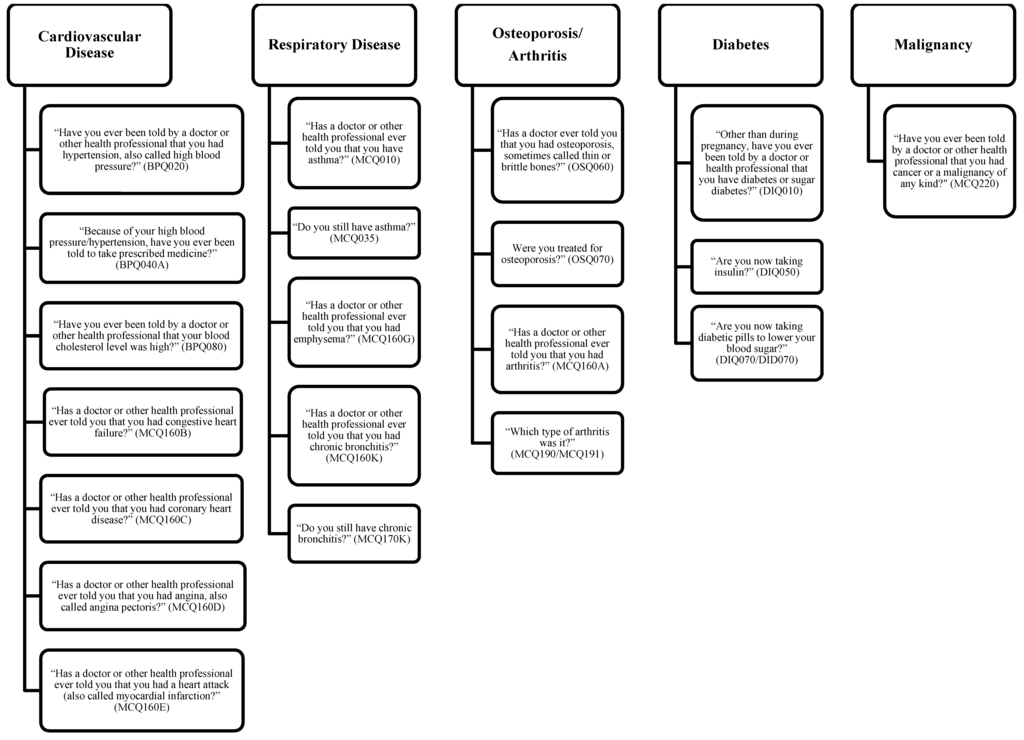 Self-response interview questions used to identify participants with chronic medical conditions: National Health and Nutrition Examination Survey (NHANES), 2003–2010.