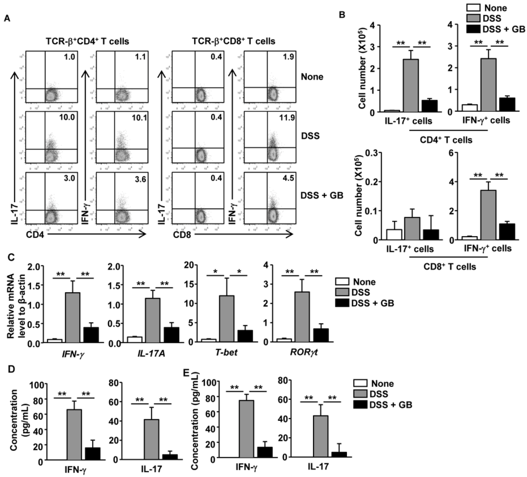 DSS-induced colitis is mediated by Th1 and Th17 responses, resulting in increased numbers of IFN-γ- and IL-17A-producing CD4 T cells in the inflamed colonic tissue [11,31,32]. The Th17 immune response also promotes neutrophil recruitment to the colon during the development of DSS-induced colitis [33,34]. Having demonstrated that the number of TCR-β+ cells and Ly-6G+ neutrophils in the colon were decreased by GB, we next tested whether GB treatment might inhibit Th1 and Th17 responses in DSS-treated mice. On day 8 of DSS administration, we analyzed intracellular cytokine production in colon infiltrating T cells. The percentages of DSS-induced IFN-γ and IL-17 producing CD4+ T cells were markedly decreased by GB treatment (Figure 3A, left panels). The percentages of DSS-induced IFN-γ-producing CD8 T cells, but not IL-17-producing CD8 T cells, were also decreased by GB treatment (Figure 3A, right panels). Accordingly, the absolute numbers of IFN-γ+ CD4, IL-17+ CD4, and IFN-γ+ CD8 T cells in the colon were significantly decreased by GB treatment of DSS-treated mice (Figure 3B). Real-time PCR analysis also showed higher mRNA levels of IFN-γ and IL-17A, and of T-bet and RORγt (the signature transcription factors for Th1 and Th17) in the colons of the DSS-treated mice than in the colons of the untreated control mice (Figure 3C). The DSS-induced increase in these genes was almost completely abolished by GB treatment (Figure 3C). Consistently, DSS-induced production of IFN-γ and IL-17 protein in the colon was also significantly reduced by GB treatment (Figure 3D). The DSS-induced increases in the IFN-γ and IL-17 protein levels in colon homogenates of the chronic colitis model were also almost completely inhibited by GB treatment (Figure 3E). Hence, these data demonstrate that GB inhibited DSS-induced Th1 and Th17 immune responses.
