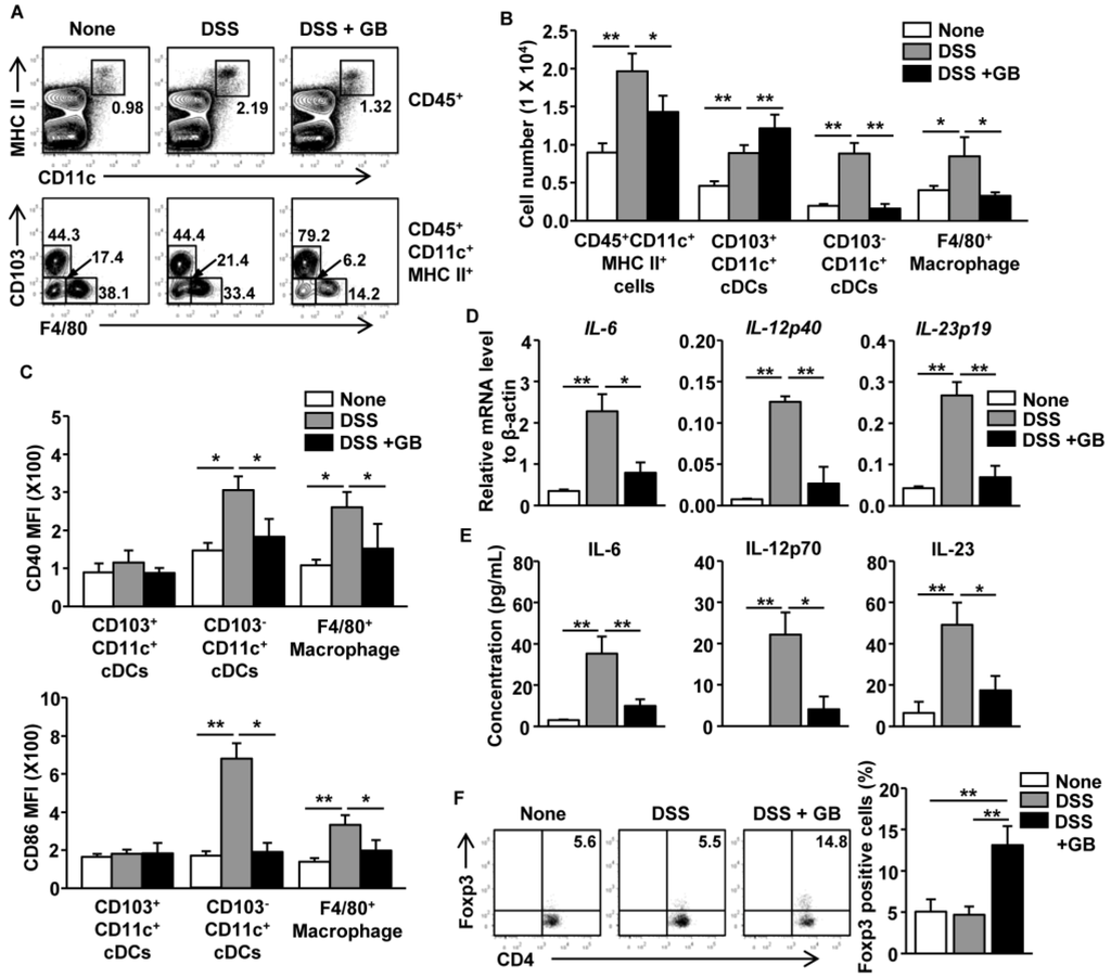 The GB treatment of DSS-treated mice led to significant increases in the frequency and cell numbers of CD103+CD11c+ migratory cDCs (Figure 5A lower panel and 5B). Since these cDCs promote migration of Foxp3+ Treg cells in the colon [15,36], we next measured Foxp3+ Treg cell infiltration in the mouse colons. We found that GB treatment induced significant increases in the numbers of Foxp3+ Treg cells in the colon in DSS-treated mice, when compared to control untreated mice or mice treated with DSS alone (Figure 5F). Thus, GB treatment appeared to suppress the DSS-induced activation of intestinal CD103−CD11c+ resident cDCs and macrophages and to induce migration or expansion of CD103+CD11c+ migratory cDCs and Foxp3+ Treg cells in the colon.