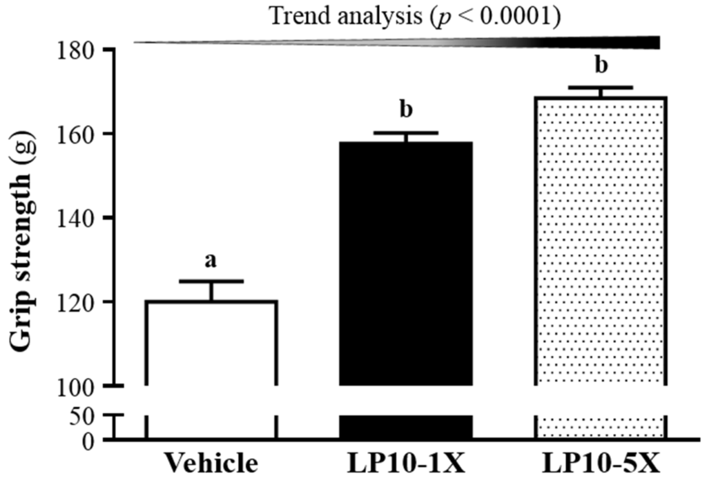 Effects of LP10 (Lactobacillus plantarum TWK10) supplementation for six weeks on forelimb grip strength. Mice were pretreated with vehicle, LP10-1X, or LP10-5X for six weeks, and then forelimb grip strength was tested. Data are mean ± SEM, 8 mice/group, by one-way ANOVA. Different letters (a, b) indicate a significant difference at p < 0.05.