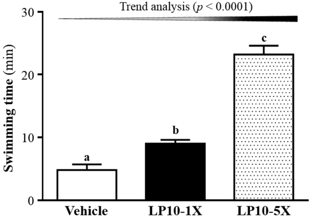 Effects of LP10 supplementation on swimming exercise performance. Mice were pretreated with vehicle, LP10-1X, LP10-5X for six weeks, and then performed an exhaustive swimming exercise with a load equivalent to 5% of body weight attached to the tail. Data are mean ± SEM, n = 8 mice/group, by one-way ANOVA. Different letters (a, b) indicate a significant difference at p < 0.05.