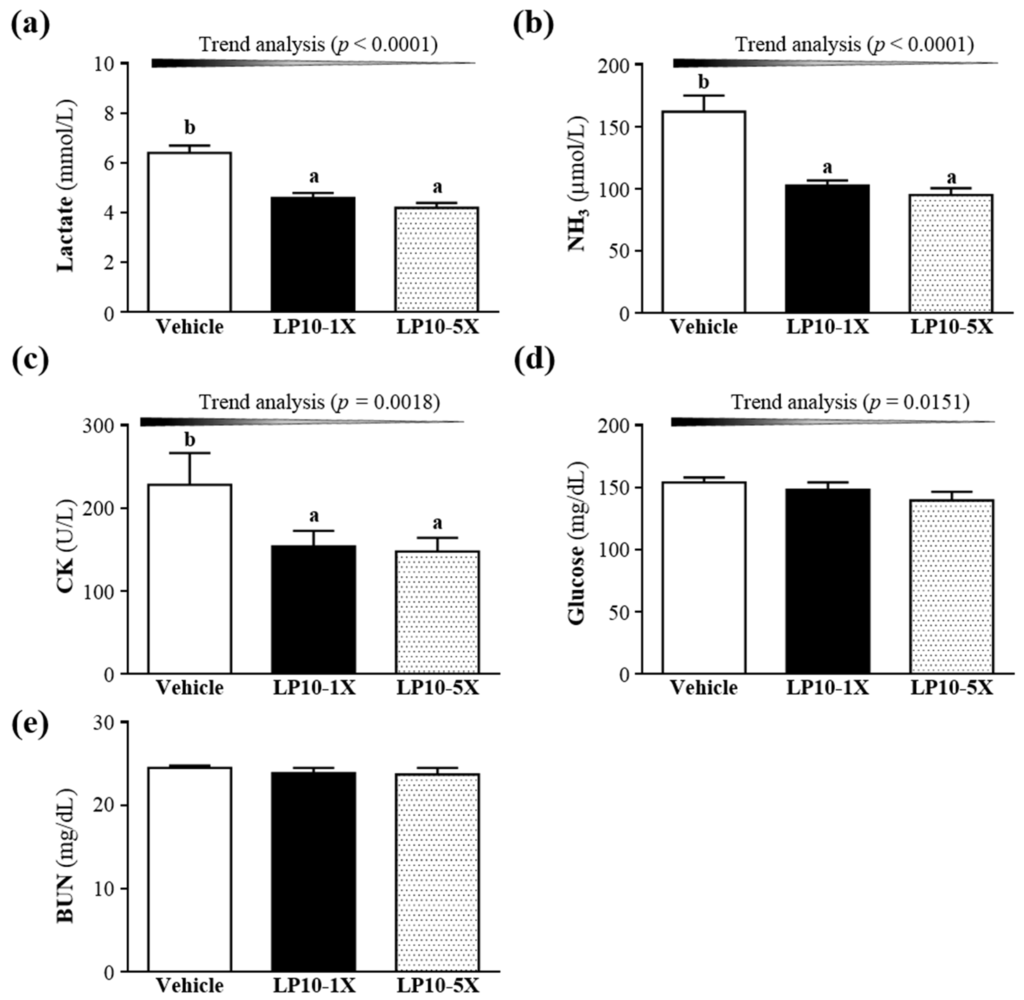 Exercise-induced muscle fatigue can be evaluated by biochemical indicators such as lactate, ammonia, glucose, CK, and BUN levels [,]. Lactate accumulates in the blood and in the muscles engaged in the exercise and exceeds the aerobic metabolic capacity. When the lactic acid concentration increases, hydrogen ions accumulate, which leads to fatigue due to acidification [,]. Lactate levels in the vehicle, LP10-1X, and LP-5X groups were 6.4 ± 0.3, 4.6 ± 0.2, and 4.2 ± 0.7 mmol/L, with lower lactate levels with LP10-1X and LP10-5X supplementation (27.88%, p = 0.0004 and 34.11%, p = 0.0005, respectively) than with vehicle treatment (Figure 3A). In the trend analysis, serum lactate level was dose-dependently decreased with increasing LP10 dose (p < 0.0001). After acute exercise, relaxation is significantly affected by the blood lactate clearance rate. Approximately 75% of the total amount of lactate produced is used for oxidative production of energy in the exercising body, and it could be utilized for the de novo synthesis of glucose in the liver []. Clinical studies have found a positive correlation between probiotics supplementation and serum biochemical indicators [,]. Probiotics supplementation has rarely been used to investigate serum biochemical levels after acute exercise. LP10 supplementation may have potential for the removal and utilization of blood lactate after exercise.