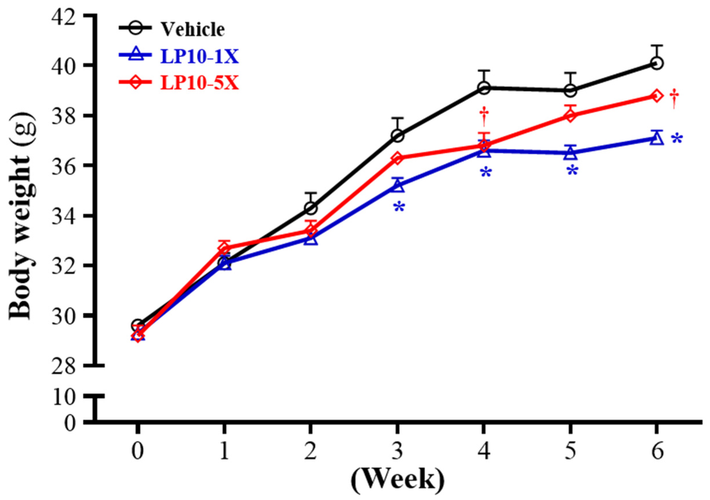 Change in body weight (BW) during the experiment. Data are mean ± SEM, n = 8/group. * p < 0.05, † p < 0.05 for LP10-1X and LP10-5X, respectively, compared with vehicle by one-way ANOVA.