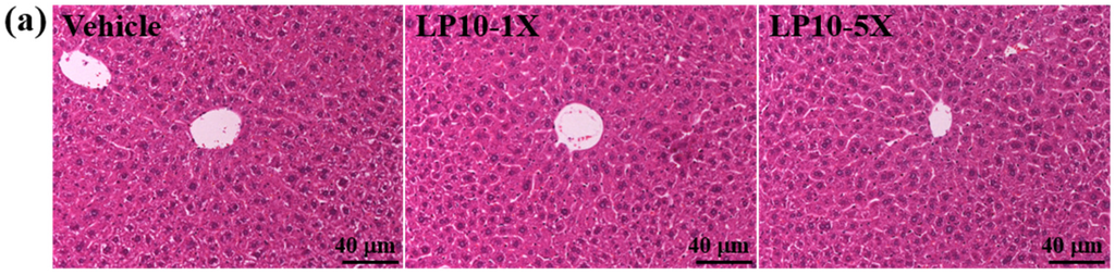 Levels of biochemical indices, including CK, TP, creatinine, UA, TC, and glucose, did not differ among groups (p > 0.05, Table 2). Serum albumin levels were lower by 7.64% (p = 0.0375) with LP10-5X than with vehicle treatment. Serum BUN levels were lower by 15.50% (p = 0.0218) and 13.29% (p = 0.0037) with LP10-1X and LP10-5X, respectively, than with vehicle treatment. On trend analysis, serum albumin (p = 0.0012) and BUN (p = 0.0017) levels were dose-dependently decreased with LP10 supplementation. Therefore, long-term daily supplementation with LP10 may have potential for tissue protection and renal benefits. In addition, serum level of TC, an index of lipid profile, was lower by 22.76% (p = 0.0069) and 26.60% (p = 0.0021) with LP10-1X and LP10-5X, respectively, than with vehicle treatment. Trend analysis showed significantly decreased serum TG levels (p = 0.0005) with increasing LP10 dose. According to a previous study, the beneficial lipid profile in Lactobacillus is attributed to the accumulation of SCFAs during fermentation []. SCFAs can transport from the intestinal lumen into the blood compartment of hosts and regulate the balance in fatty acid synthesis []. In addition, LP10 supplementation for six weeks had no adverse effects on major organs such as the liver, skeletal muscle, heart, kidney, lung, and EFP. Therefore, the dose of LP10 supplementation used in this study was safe (Figure 5).