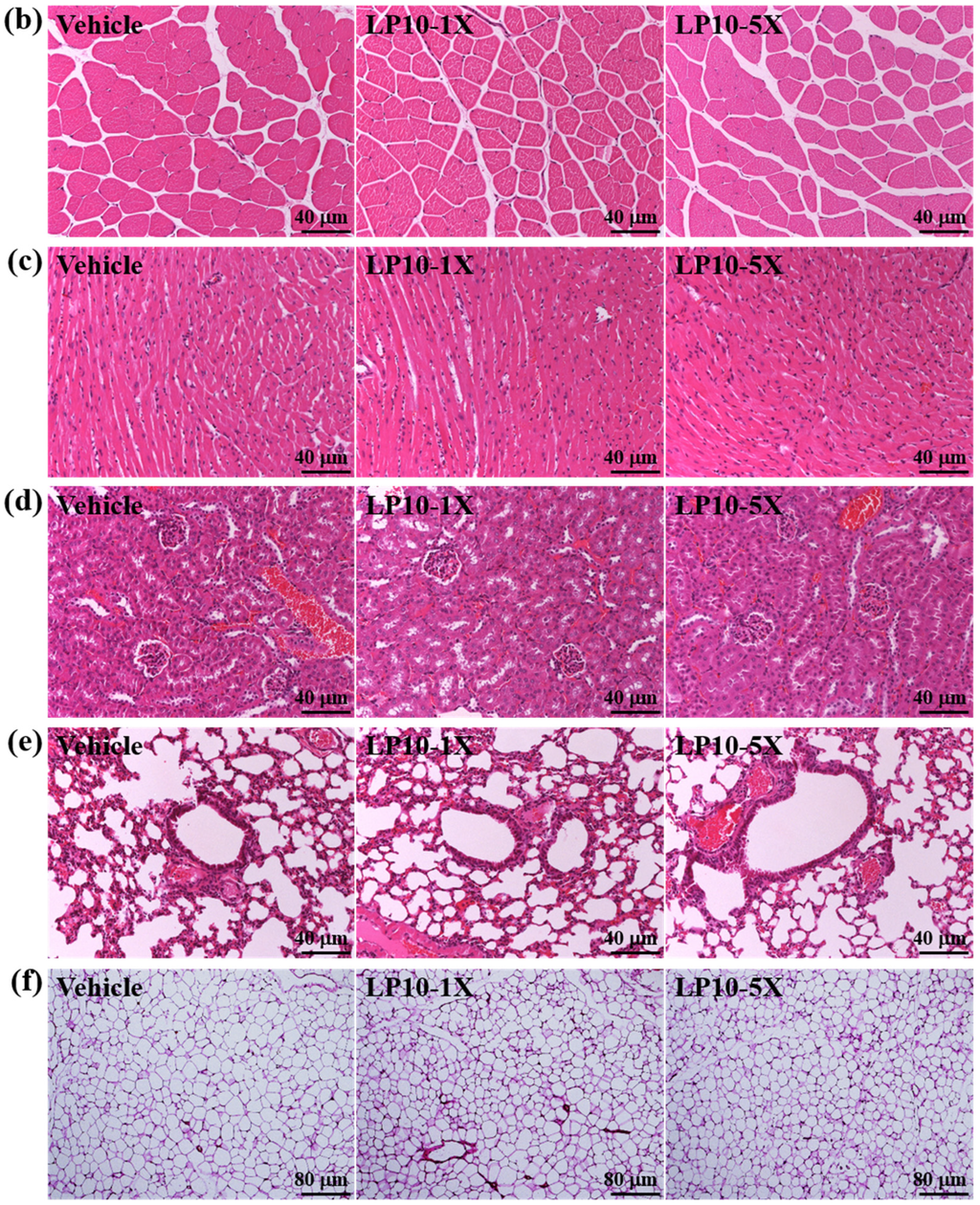 We observed beneficial effects of LP10 on grip strength and exhaustive exercise challenge, as well as other physiological effects, with six-week LP10 supplementation. We further investigated whether six-week LP10 treatment affected other biochemical markers in healthy mice. We examined tissue- and health status-related biochemical variables and major organs including skeletal muscle, heart, kidney, and lung (Table 2).