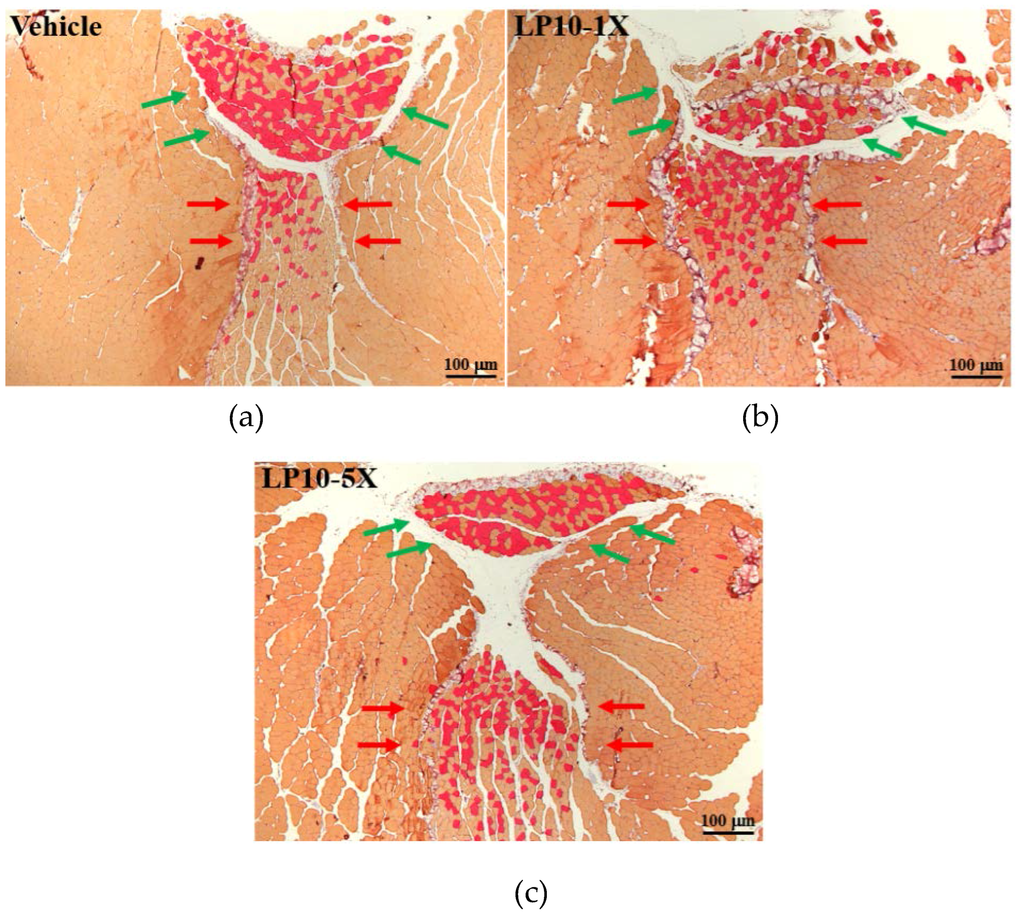 Immunohistochemistry (IHC) of effect of LP10 supplementation with: vehicle (a); LP10-1X (b); and LP10-5X (c) on type I and type II muscle fibers in gastrocnemius muscle. Red fibers are type I fibers; orange fibers are type II fibers. Specimens were photographed by light microscopy. (IHC stain, magnification: ×50).