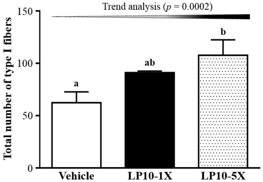Total number of type I muscle fibers with LP10 supplementation in gastrocnemius muscle of mice. Data are mean ± SEM, n = 8 mice/group. Different letters (a, b) indicate a significant difference at p < 0.05 by one-way ANOVA.