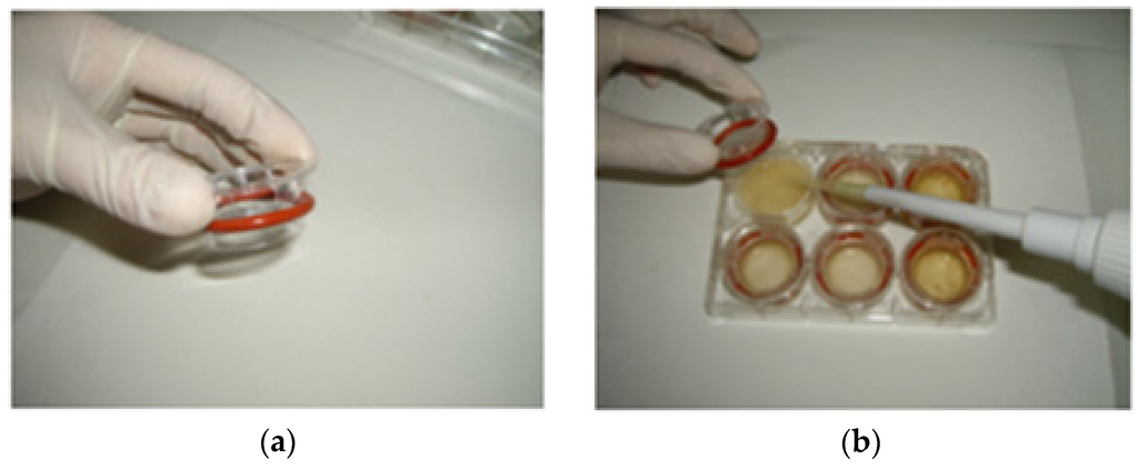 (a) A cylindrical insert with a piece of dialysis membrane fastened to one end with an elastic band; (b) The inserts are placed in 6-well plates in a way that the membrane is in contact with the digest.