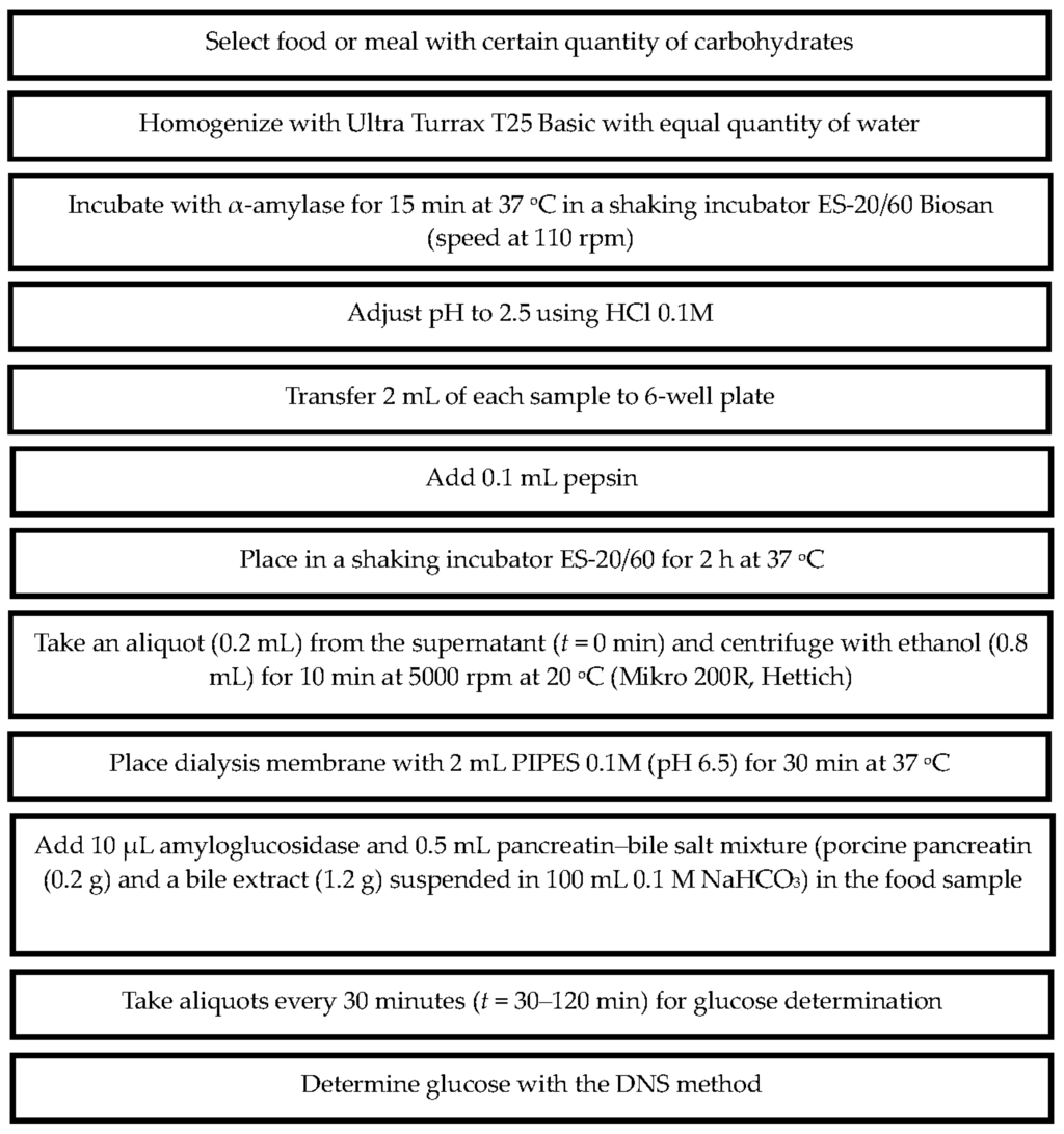 Various in vitro methods have been proposed in order to predict the glycemic properties of foods [13,14,15,16,17,18,19]. In vitro methods measure the digestibility of carbohydrates after a procedure that mimics the oral, gastric and intestinal phases of human digestion [20], although not all studies include the oral phase [21,22]. Further differences amongst methods include the duration of each digestion phase, the type of enzymes present, and/or the indices that are employed (e.g., rapidly available glucose, hydrolysis index, and glycemic glucose equivalents) [12,13]. Although some methods are reasonably simple [13], others demand sophisticated laboratory equipment, expensive reagents, trained personnel and complex calculations [23]. Although the large variability in existing methods offers multiple tools for approaching diverse research objectives, the lack of a standardized, validated and widely accepted in vitro protocol is challenging. Furthermore, due to the increasing interest in the prediction of glycemic response of foods and meals, particularly within routine applications, there is still a need for the development of protocols that are simpler than the existing ones; this need emerges because of the increasing interest for the prediction of glycemic response of foods and meals particularly in routine applications. For example, some applications, such as the screening processes that take place during the development of new food products, simple methods that show trends and comparisons amongst foods may be preferable to more complex methods that predict GI through linear regression models.
