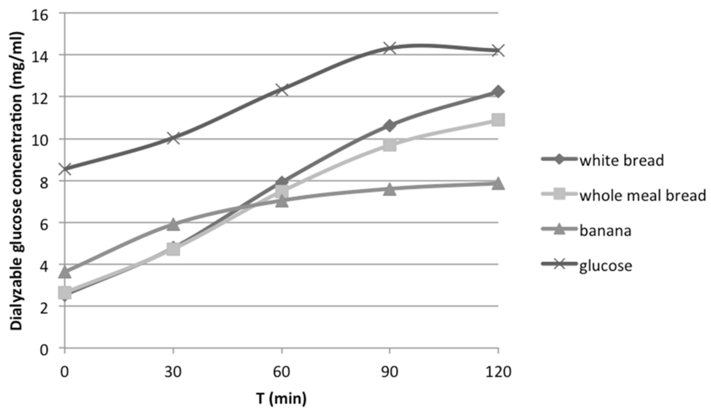 - The index that reflects glycemic response is dialyzable glucose determined spectrophotometrically at 120 min after the second phase of the in vitro digestion. Various indices (carbohydrate digestion rate (rapid/slow), hydrolysis index, glucose equivalents) have been previously used for the correlation of in vitro carbohydrate digestion with glycemic response in humans or the GI of meals [13,15,28,36,37,38]. For example, Englyst et al. [13] found that the in vitro measurement of rapidly available glucose in foods can reflect the glycemic response employing a rapid yet more sophisticated set up than the proposed herein.