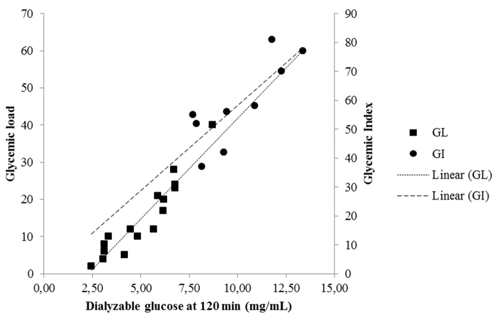 Dialyzable glucose, measured at t = 0, 30, 60, 90, and 120 min of the second phase of the digestion, was correlated with GI or GL values reported in the literature [24].