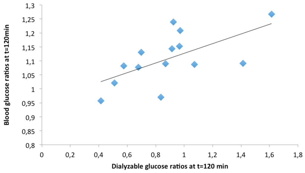 Dialyzable glucose ratios, estimated from dialyzable glucose obtained during the in vitro digestion of the 14 meals (Table 3) at t = 0, 30, 60, 90, 120 min after the initiation of the second phase of the digestion process, was correlated with blood glucose ratios in volunteers, at the same time points after the ingestion of the respective meals (Table 4). The highest correlation was found at 120 min (Spearman’s rho = 0.736, p = 0.003); dialyzable glucose ratios at 120 min are plotted against blood glucose ratios in Figure 5.