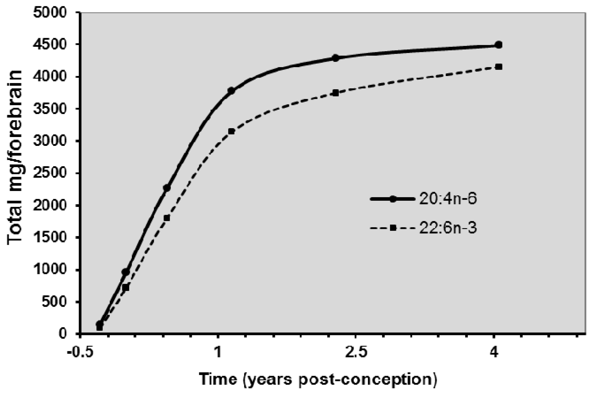 Long-chain polyunsaturated fatty acids (LCPUFA) accretion in the human brain during perinatal development (Data from Martinez [15]).