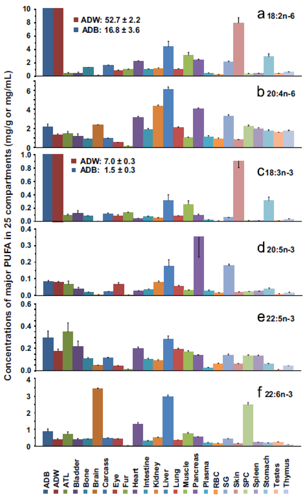 Distribution of fatty acids in 25 different tissue compartments in young male rats. Abbreviations: ATL, adrenal gland, thyroid gland, mandibular gland, and lymph nodes; RBC, red blood cell; SG, salivary gland; ADB, brown adipose tissue; ADW, white adipose tissue (from Salem et al. [52]).