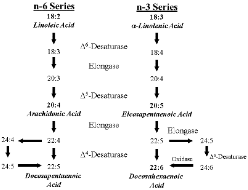 As shown in rat pups, when tissues are deprived of n-3 PUFA, the accretion of ARA from LA is increased and ARA is further metabolized to produce docosapentaenoic acid (22:5n-6, DPA) which accumulates in tissues [53], particularly in the nervous system. The accumulated DPA in turn reciprocally replaces lost DHA in tissue [53].