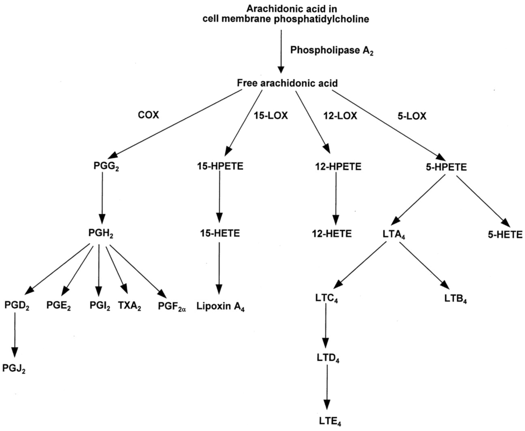 ARA is the substrate for the biosynthesis of prostaglandins. Prostaglandins and thromboxane A2 are collectively called prostanoids. Prostanoids are formed when ARA is released from the plasma membrane by phospholipase and metabolized by the sequential actions of prostaglandin G/H synthase, or cyclooxygenase (COX), and by respective synthesis [100]. Prostanoids serve a variety of functions. The adhesion-type prostaglandins as well as prostacyclin are important in vasodilation and in anti-thrombus formation [103]. The E series prostaglandins act to dilate arterioles and capillaries to bring about a drop in blood pressure, relax vascular smooth muscle, open the bronchi of the lungs, and enhance blood flow through the kidney [104]. Prostaglandins are also involved in sleep regulation [105], febrile response [106], and in pain perception [107].