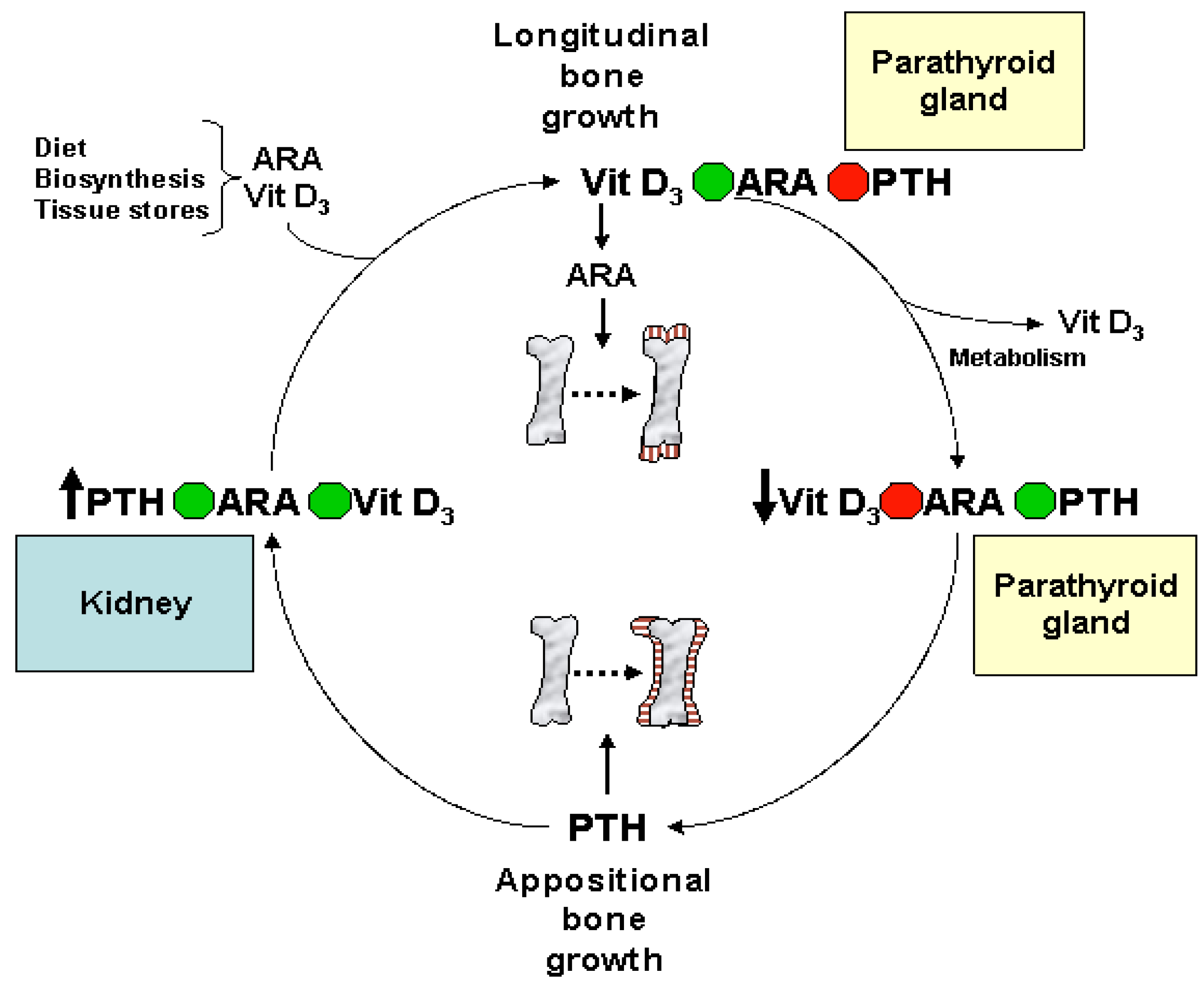 The role of ARA in bone development and homeostatic regulation of vitamin D3 and parathyroid hormone (PTH) levels along the parathyroid gland-kidney axis during growth. ARA and vitamin D3 are acquired from the diet and/or from endogenous sources. ARA mediates vitamin D3 regulation of chondrocyte proliferation and growth plate mineralization during bone elongation. As vitamin D3 is metabolized and levels subside, ARA-dependent PTH suppression is diminished and PTH production by the parathyroid gland is upregulated. This results in increased periosteal bone mineral content (appositional bone growth). In kidney, PTH induces the ARA-mediated increase in vitamin D3 activation and secretion, elevating the amount of vitamin D3 in circulation. The cycle continues as the restoration of vitamin D3 results in the ARA-dependent suppression of PTH and stimulates longitudinal bone growth.