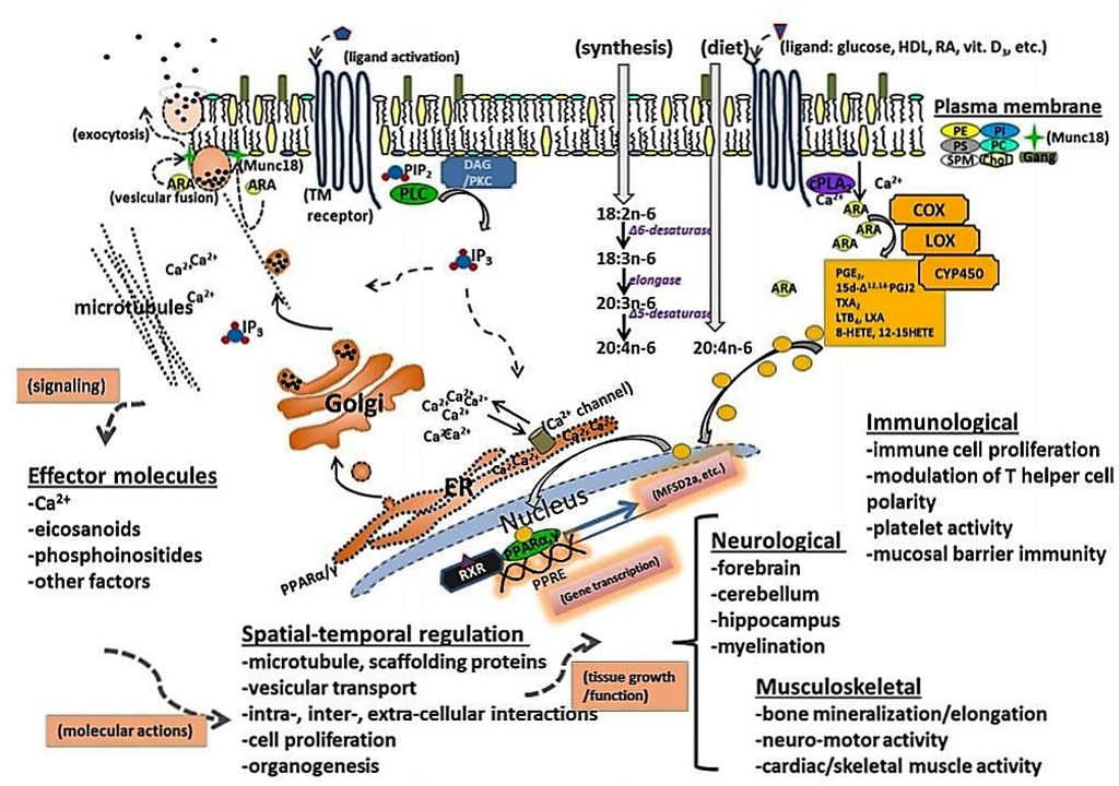 Over the last decade, there has been increased understanding of the molecular roles that the n-3 and n-6 PUFA play in brain and cellular function. The variety of functions shown to be related to ARA indicates its importance and essentiality in the metabolic chain of events leading to brain structural lipid development, signaling, and many basic cellular functions.