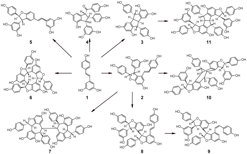 Scheme of formation of viniferins and resveratrol oligomers in grape: (1) trans-resveratrol; (2) (E and Z) ε-viniferin/ω-viniferin; (3) pallidol; (4) caraphenol B; (5) δ-viniferin (E and Z); (6) α-viniferin; (7) isohopeaphenol; (8) E-miyabenol C; (9) Z-miyabenol C; (10) vaticanol C isomer; and (11) ampelopsin H [1].