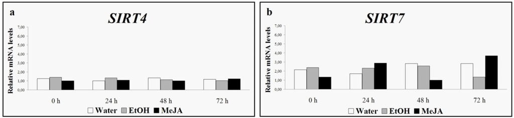 SIRT4 (a) and SIRT7 (b) expression levels induced by water, ethanol (EtOH) and methyl jasmonate (MeJA) [38].