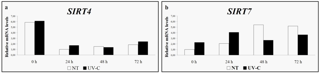SIRT4 (a) and SIRT7 (b) expression levels in untreated control (NT) and UV-C treated leaves [38].