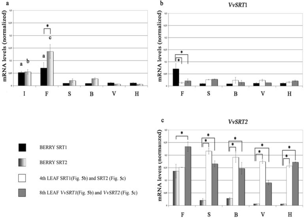 The expression profiles of the two genes in berries are reported. Grapevine growth stages: I, clear inflorescence; F, start of flowering; S, fruit set; B, pea-sized berries; V, veraison; H, harvest. (a) reports the comparison between the expression profiles of both genes during the different stages. The two genes have similar expression patterns with the exception of the start of flowering, where the expression level of VvSRT2 is significantly higher (c). The expression level of both genes in the early stages is significantly higher than in the remaining stages: VvSRT1 (black boxes) shows no difference between clear inflorescence and the start of flowering (a), while VvSRT2 (shaded grey boxes) shows significant differences between clear inflorescence (b) and the start of flowering (c); (b) reports the expression level of VvSRT1 during the different growing stages in different plant organs: berries (black boxes), fourth leaf (white boxes) and eighth leaf (dark grey boxes); (c) Reports the expression level of VvSRT2 in the different stages and different plant organs: berries (shaded grey boxes), fourth leaf (white boxes) and eighth leaf (dark grey boxes). Error bar indicates ± SD. * p < 0.05 (Post-Hoc with Bonferroni correction). Reproduced from [39] with permission.