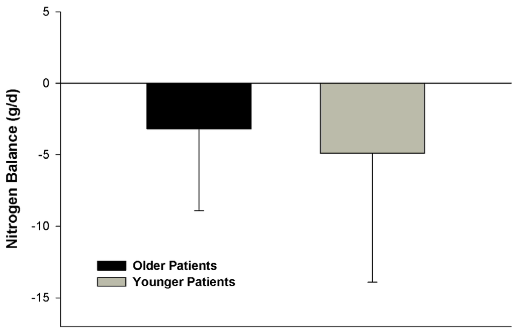 We presumed the trending difference in nitrogen balance between age groups in the above study [43] may have been attributed to potential anabolic resistance associated with aging. Conversely, we hypothesized that an insufficient amount of protein, particularly in reference to caloric intake, was given to overcome this resistance in that study. To test this hypothesis, we retrospectively compared the metabolic response to hypocaloric high protein nutrition therapy in 33 older (60 years of age and older) and 41 younger (18 to 59 years of age) with obesity and traumatic injuries [42]. Only patients who received at least 2 g/kg ideal body weight/day of protein intake and a nitrogen balance determination at goal protein intake were enrolled for study. When given isonitrogenous regimens (2.3 ± 0.3 g/kg ideal body weight/day vs. 2.3 ± 0.2 g/kg ideal body weight/day, respectively) and at a greater protein intake than the Liu study [43], no significant difference in nitrogen balance was noted between age groups (Figure 1). Although it was anticipated that the majority of patients in our study would be in negative nitrogen balance due to critical illness and timing of the nitrogen balance determination post-traumatic injury, about half of the patients from each group achieved a positive nitrogen balance or nitrogen equilibrium. These data suggested that the severity of the net protein catabolism could be at least partially ameliorated by aggressive nutrition therapy [1].